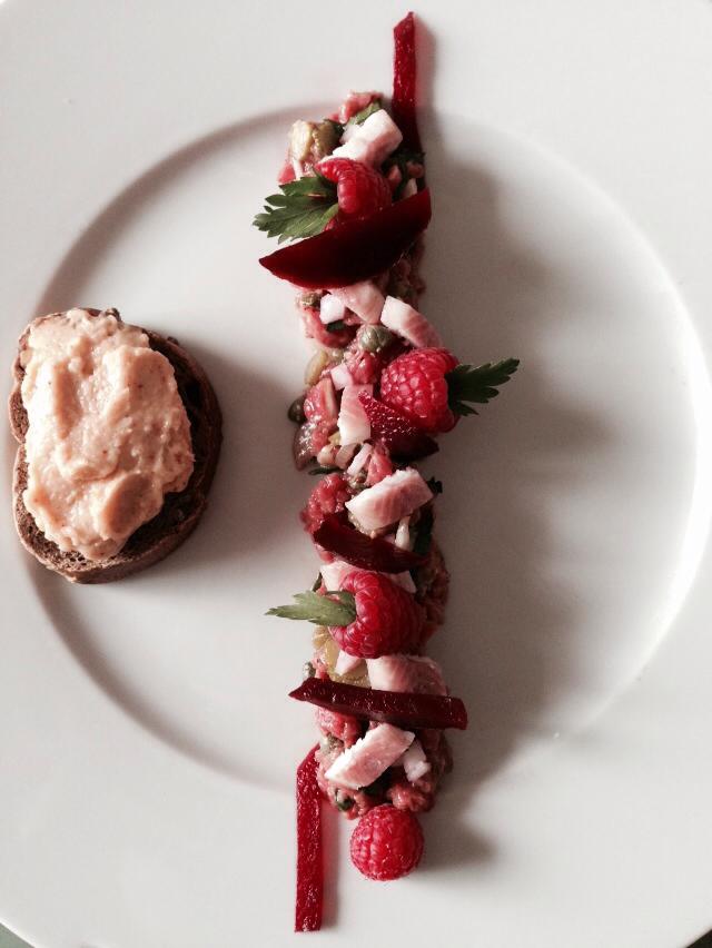 Là dessus, des fines tranches d’anguille fumée pour l’iode, des framboises pour le peps, de la betterave juste cuite pour la rondeur, du radis noir pour la fraîcheur, et une belle tartine de tarama au piment d’Espelette pour la gourmandise.
